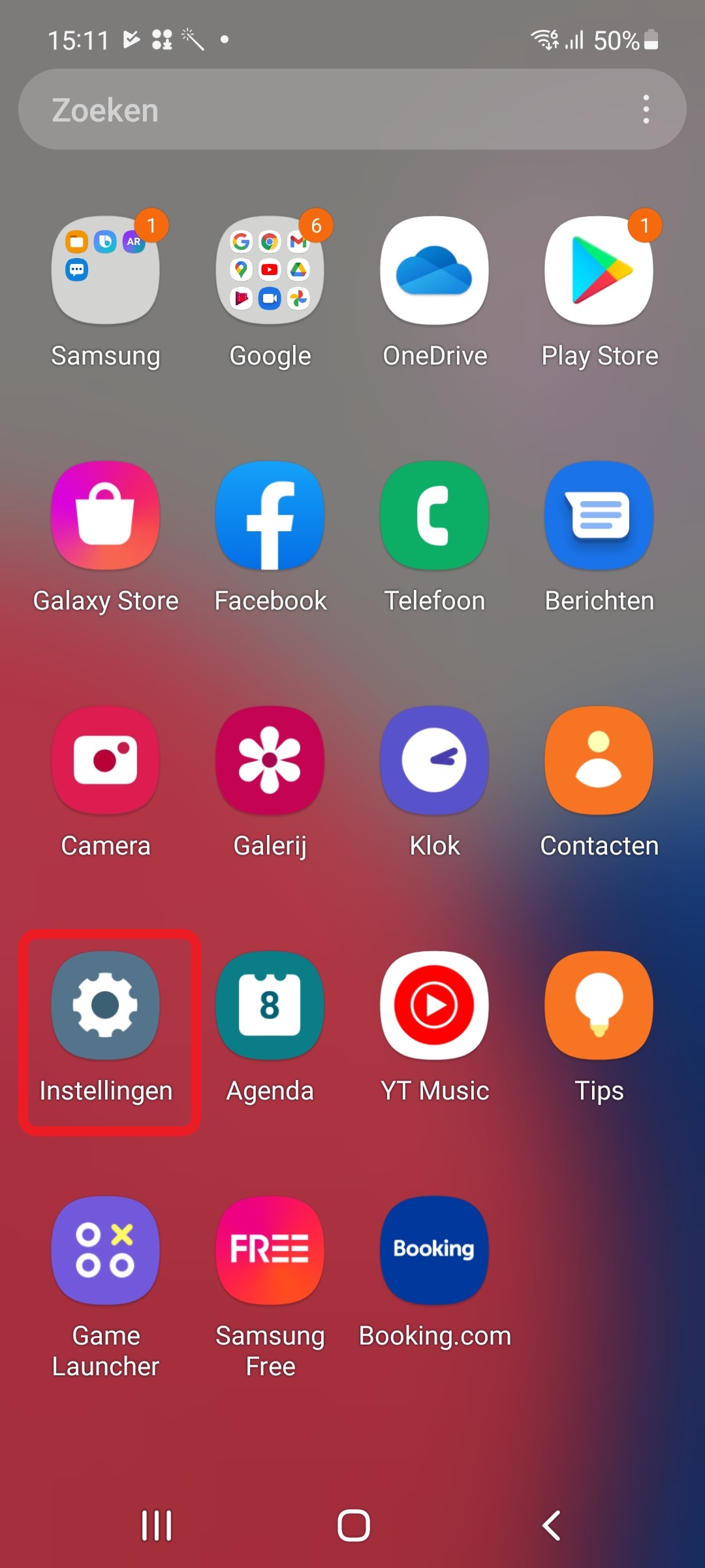 - Open het Instellingen of Settings menu op je telefoon (naar beneden swipen vanaf bovenzijde op homescherm en daarna op tandwiel klikken).